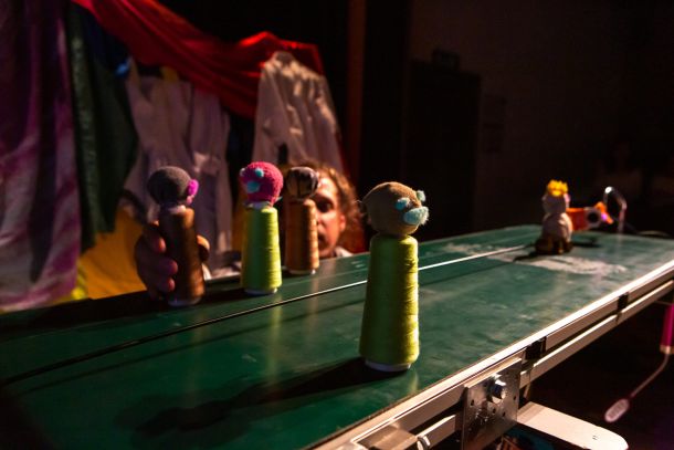 Kombinacija glumačke igre uz animaciju predmeta (špule konca kao podanici) i lutaka (kralj naglašeno malih dimenzija), te uporaba snimaka na ekranu daje uzbudljivu zbrku u kojoj se „krojači“ odlično snalaze, dok su svi drugi zbunjeni.
