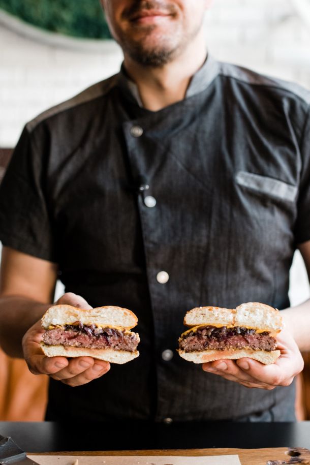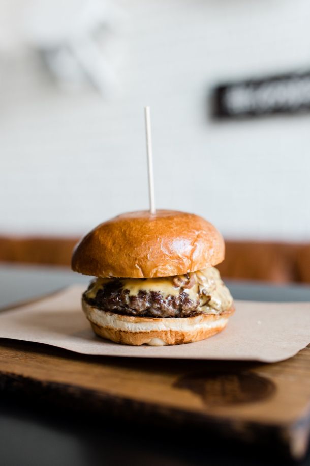 Podatno brioche pecivo napunjeno je s 42 dana odležanim junećim mesom, karameliziranim lukom, Cheddar sirom i vrlo malo umaka na bazi senfa i majoneze.