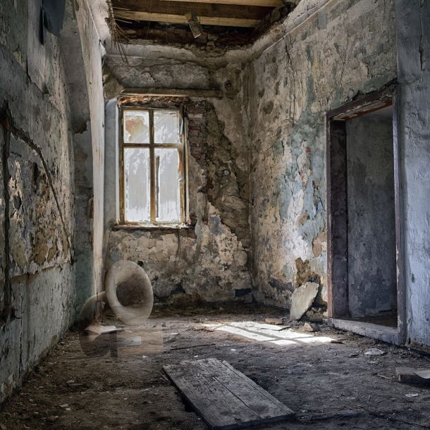 Šare nastale prokišnjavnjem, cigle razbacane po podu, oguljena boja sa zidova i zaboravljeni predmeti (upotpunjeni glazbom) čine Golčareve fotografije malim remek djelima melankolije.
