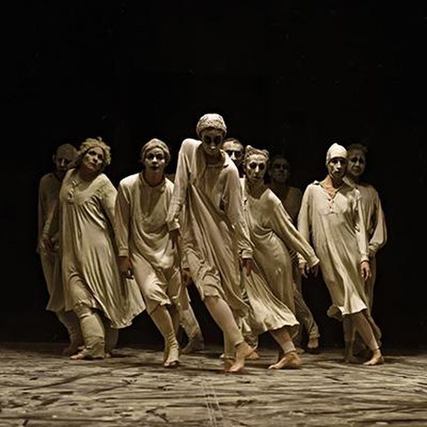 Po pet plesača i plesačica neodređene dobi, lica prekrivenih bijelom glinom (koja također prekriva pod) i odjeveni u dronjaste, „oprave“ (Louise Marin) kreću se mehanički precizno pri čemu ispuštaju neke čudne, pomalo zastrašujuće zvukove.
